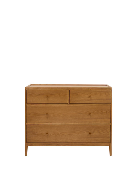 The Salina 4 drawer wide chest offers substantial storage space for all your clothes, with 2 small drawers at the top and 2 wider and deeper drawers below. As with the rest of the Salina range it has a practical tray top which stops items rolling off the surface. Made of solid ash with a Vintage finish.